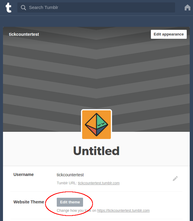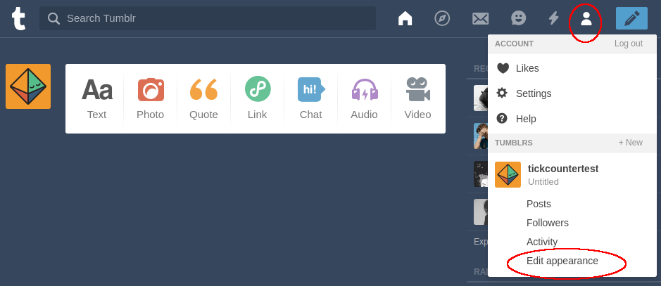 In Tumblr dashboard, click on Account icon and go to Edit appearance.